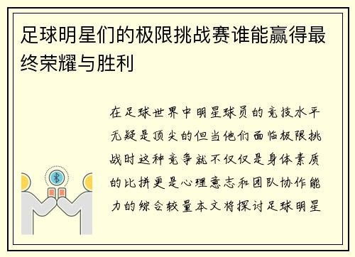 在现代足球界,运动员不仅仅是体育竞技的参与者,他们往往也是时尚潮流的引领者。戴发夹的足球明星,以其独特的风格和鲜明的个性,展现出运动与时尚完美结合的新风貌。本文将从四个方面详细探讨这一现象:首先,分析戴发夹对球员形象与气质的提升,其次,讨论这种装饰如何成为个人品牌的重要组成部分,再者,探寻足球场上这种独特风格所传递的积极信息,以及最后,从社会文化视角看待这一趋势的发展。通过这些方面,我们可以全面理...