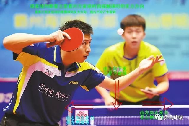 判断来球的旋转的最简单方法是看对方接触球瞬间的挥拍动作。不要被对手发球前花里胡哨的假动作迷惑,要紧盯着对手的球拍就看接触球的一瞬间动作走向。以发球者右手执拍为例:从后上向前下挥是下旋球;从左向右挥是右侧旋球;从右向左挥是左侧旋球;从后下向前上挥是上旋球(奔球)。更复杂一点的就是从左下向右上挥是右侧上旋球;从右上向左下挥是左下侧旋球等等。